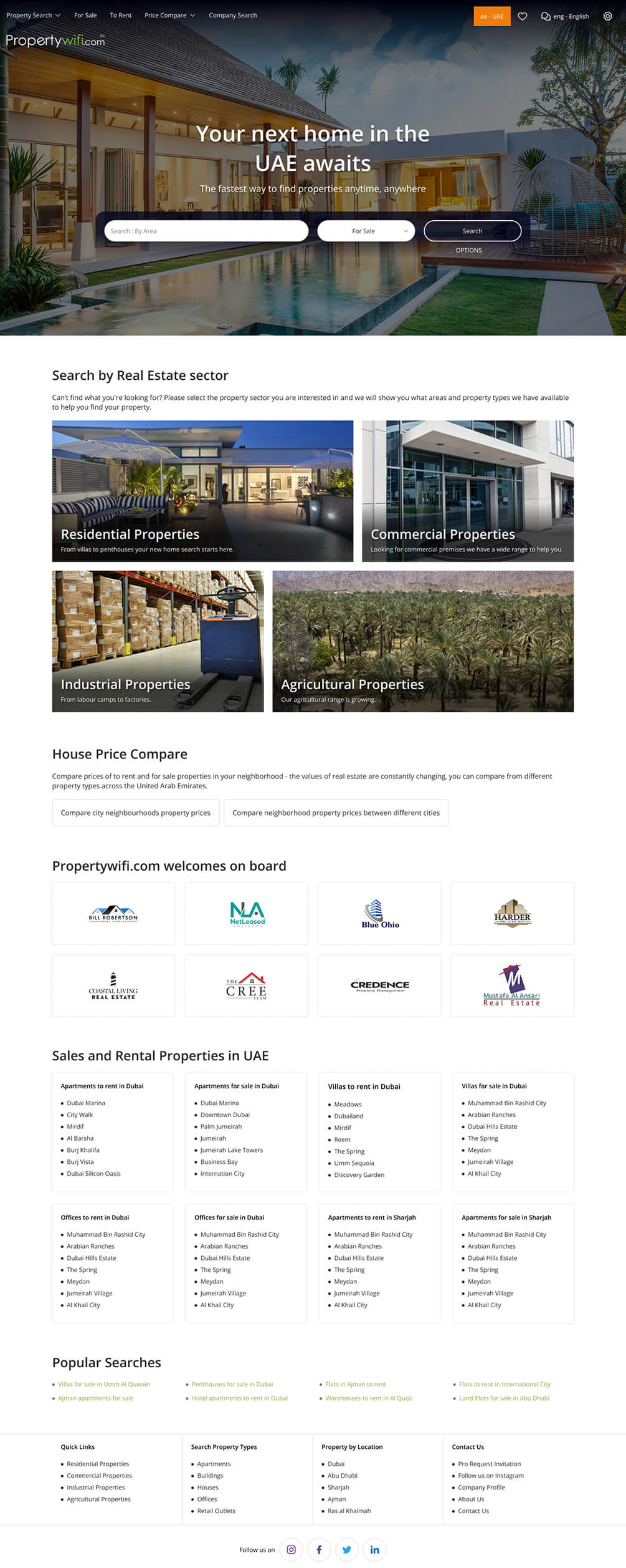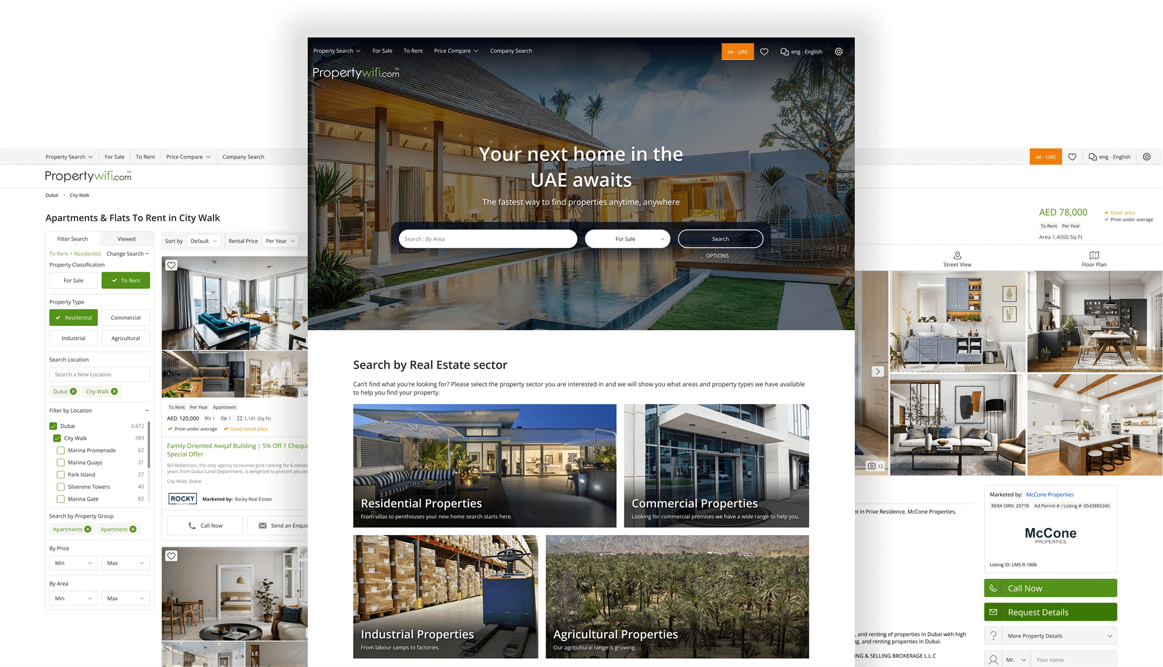 PropertyWifi is a bilingual (Arabic & English) property search platform designed to simplify how users discover real estate opportunities across multiple sectors. The platform serves the Residential, Commercial, Industrial, and Agricultural sales and rental markets, offering a unified experience for diverse property needs.